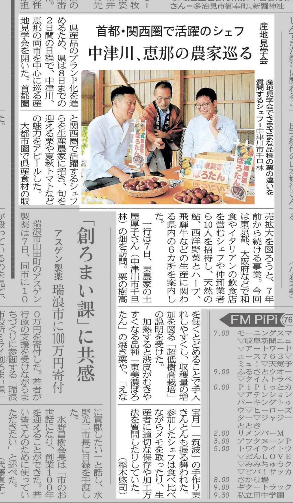 岐阜で出会う。シェフとめぐる「岐阜県産地探訪 食材見学会」に参加 2025 11/14 Uncategorized 2025年11月14日 料理王国 岐阜で出会う。シェフとめぐる「岐阜県産地探訪 食材見学会」を開催 - 料理王国 飛騨の山々や美濃の清流など、山紫水明の地として知られる岐阜県。今回は岐阜県を舞台に1泊2日の産地見学会を行った。関東・関西から訪れた10名のシェフ及びバイヤーは、多... Uncategorized よかったらシェアしてね! URLをコピーしました! URLをコピーしました! 冬の味覚の王様、タグ付き蟹コース期間限定で提供開始致します。 この記事を書いた人 hioka0303 関連記事 冬の味覚の王様、タグ付き蟹コース期間限定で提供開始致します。 2025年11月14日 奈良県産松茸特別コース提供開始 2025年10月22日 岐阜新聞に掲載していただきました! 2025年10月13日 明日、9月20日【土】テレビ出演致します! 2025年9月19日 8/9 酢で魅せる、夏の皿をテーマに料理教室を行います。 2025年7月28日